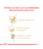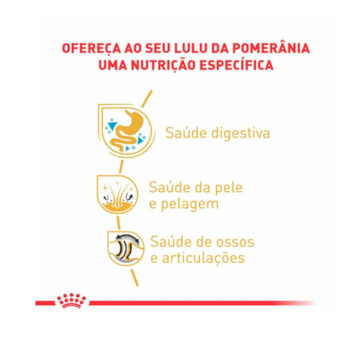 Alimento completo úmido para cães adultos e maduros da raça Pomeranian – A partir de 8 meses de idade. A Ração Royal Canin Sachê Breed Health Nutrition para Cães Adultos Pomeranian foi elaborada com conteúdo adaptado de EPA e DHA, visando auxiliar a saúde e contribuir para a beleza dos pelos, contém fibras e proteínas altamente digeríveis, estimulando o trânsito intestinal e fornecendo a consistência ideal das fezes.