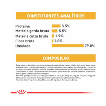Água, vísceras de suínos, carne mecanicamente separada de frango, miúdos de frango, fígado suíno, amido de milho, celulose, óleo de peixe refinado, óleo de girassol, plasma sanguíneo suíno, cloreto de potássio, carbonato de cálcio, óxido de magnésio, hidrocloreto de glicosamina, sulfato de condroitina, tripolifosfato de sódio, carbonato de sódio, carragena, goma alfarroba, corante caramelo, ácido cítrico, zeolita, goma xantana, extrato de marigold, vitaminas (C, D3, E, B1, B2, B6, B12, PP), pantotenato de cálcio, biotina, ácido fólico, cloreto de colina, sulfato de zinco, sulfato de ferro, sulfato de manganês, sulfato de cobre, iodato de cálcio, zinco aminoácido quelato, manganês aminoácido quelato, cobre aminoácido quelato, taurina, L-carnitina.