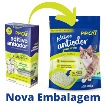 Compatível com todos os tipos de granulados sanitários: a versatilidade do Pipicat Aditivo Antiodor Campestre permite que ele seja usado com qualquer tipo de granulado sanitário, garantindo uma solução eficaz independentemente da preferência do seu gato.