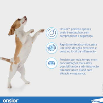 Para tratar e aliviar a dor e inflamação causadas pela osteoartrite, o medicamento Onsior deve ser oferecido por via oral, numa dose de 1 a 2 mg por quilo de peso do pet, uma vez ao dia, sempre no mesmo horário. Para alívio da dor e inflamação após cirurgias de tecidos moles em cães, o Onsior pode ser administrado no pós-operatório, seguindo a mesma dose indicada para osteoartrite (1 a 2 mg/kg) por até 14 dias.