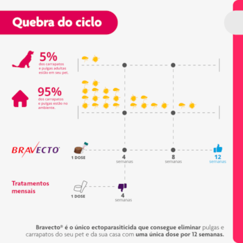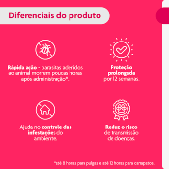 - Proteção prolongada: até 12 semanas (3 meses) contra pulgas e carrapatos;