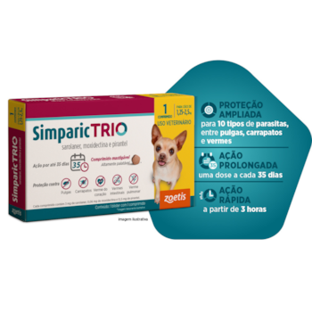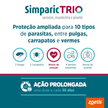 O Simparic Trio é um antiparasitário oral para cães que oferece proteção ampla e eficaz em um único comprimido mensal. Com ação contra pulgas, carrapatos, vermes intestinais e prevenção da dirofilariose (verme do coração), ele simplifica a rotina de cuidados e garante mais segurança para a saúde do seu pet.