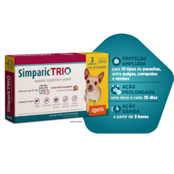 O Simparic Trio é um antiparasitário oral para cães que oferece proteção ampla e eficaz em um único comprimido mensal. Com ação contra pulgas, carrapatos, vermes intestinais e prevenção da dirofilariose (verme do coração), ele simplifica a rotina de cuidados e garante mais segurança para a saúde do seu pet.