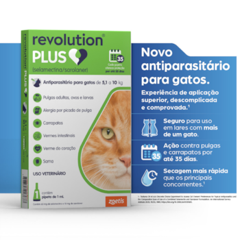 O Revolution Plus é um antipulgas e carrapaticida de alta eficácia, desenvolvido especialmente para proteger os gatos contra múltiplos parasitas com segurança e praticidade. Sua fórmula inovadora oferece ação 6 em 1, combatendo pulgas, carrapatos, sarna de ouvido, vermes intestinais e verme do coração, proporcionando uma proteção completa por até 35 dias.