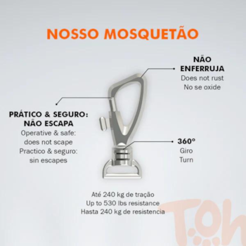 A guia é equipada com um mosquetão exclusivo, oferecendo maior segurança e praticidade. O encaixe resistente dispensa a necessidade de rosquear, tornando o uso ainda mais fácil. Além disso, a base giratória permite movimentos livres, evitando torções indesejadas.