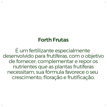 Atenção: Não jogar o adubo nas folhas. Para o plantio das frutíferas utilize o FORTH Plantio. Evitar aplicar nas horas mais quentes e sempre regar logo em seguida aplicação. A adubação com FORTH Frutas deve ser feita somente 30 dias após o plantio.