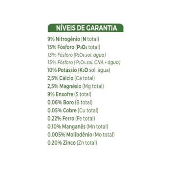 | Fósforo (P2O5 solúvel em CNA + água) | 15% |