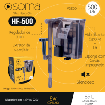 A nova linha de filtros Hang-On da marca Soma traz ao mercado o modelo HF-500, um produto que se destaca pela eficiência e pela facilidade de uso. Este filtro foi especialmente desenvolvido para aquários de até 65 litros, oferecendo a potência ideal de 8 watts em funcionamento em 220v. Sua tecnologia silenciosa e a alta capacidade de circulação de água tornam este filtro uma escolha excelente para quem busca manter a água cristalina sem causar incômodo aos peixes.