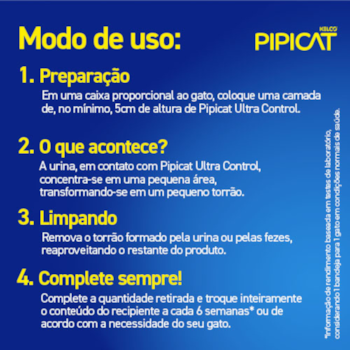 - A preparação: Em uma caixa de tamanho proporcional ao seu gato, coloque uma camada de, no mínimo, 5 cm de altura de Pipicat Ultra Control. Caso você tenha mais de um gato, recomendamos disponibilizar uma caixa de granulado para cada gato.