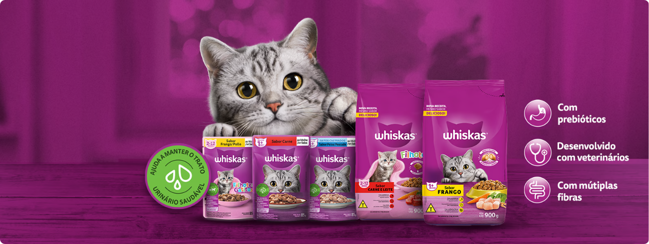 A Whiskas é uma marca renomada que oferece uma alimentação balanceada e nutritiva para gatos de todas as idades e raças. Parte do portfólio da Mars Petcare, a marca tem o compromisso de proporcionar o melhor em nutrição animal, com produtos desenvolvidos para atender às necessidades específicas dos felinos, seja em sua fase de filhote, adulta ou sênior.