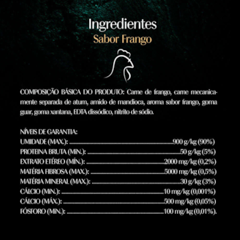 Carne de frango, carne mecanicamente separada de atum, amido de mandioca, aroma sabor frango, aroma sabor peixe, goma guar, goma xantana, EDTA dissódico, nitrito de sódio.