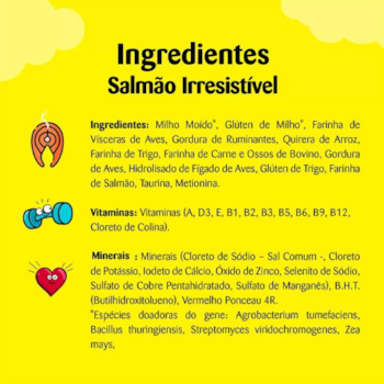 Farinha de Subprodutos de Frango, Glúten de Milho*, Quirera de Arroz, Milho Integral Moído*, Gordura de Frango, Gordura Bovina, Glúten de Trigo, Farinha de Trigo, Hidrolisado de Fígado de Frango, Taurina, Metionina, Vitaminas (A, B1, B2, B6, B12, D3, E, K3, Ácido Fólico, Niacina, Biotina, Cloreto de Colina e Ácido Pantotênico), Minerais (Cloreto de Sódio - sal comum -, Cloreto de Potássio, Iodato de Cálcio, Óxido de Zinco, Selenito de Sódio, Sulfato de Cobre, Sulfato de Manganês), BHT, Corantes (Caramelo e Dióxido de Titânio). Eventuais Substitutivos: Fosfato bicálcico, Farinha de carne e ossos. * Espécies doadoras do gene: Agrobacterium tumefaciens, Bacillus thuringiensis, Streptomyces viridochromogenes, Zea mays.