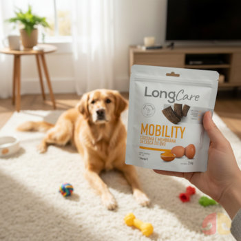 O conceito do Snack LongCare Mobility vai além do agrado. Trata-se de um petisco super premium, elaborado com orientação veterinária e focado em cães adultos que precisam de suporte articular contínuo. A presença da cúrcuma, ingrediente reconhecido por seu potencial anti-inflamatório natural, atua em sinergia com a membrana da casca do ovo, fonte funcional associada à saúde das articulações e à manutenção da mobilidade.