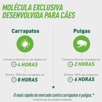 Contra carrapatos, início de ação em 4 horas e elimina 100% em até 8 horas no caso novas infestações.