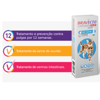 O Antipulgas Transdermal Bravecto Plus é um tratamento adequado contra pulgas, carrapatos, vermes intestinais e sarnas, combatendo as pulgas do ambiente por 12 semanas, protegendo de contaminações externas futuras.