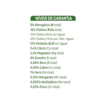 Nitrogênio total (N) = 6%, Fósforo (P2O5) = 18%, Potássio (K2O) = 12%, Cálcio (Ca)= 2%, Magnésio (Mg) = 2%, Enxofre (S) = 5%, Boro (B) = 0,06%, Ferro (Fe) = 1%, Molibdênio (Mo) = 0,005%, Cobre (Cu) = 0,05%, Manganês (Mn) = 0,08%, Zinco (Zn) = 0,2%, Elementos derivados de nitratos, fosfatos, sulfatos e micro elementos.