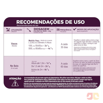 Atenção: As recomendações são para todas as espécies de Jabuticabeiras. Não utilizar vasos cônicos. Não jogar o adubo nas folhas. Para o plantio das Jabuticabeiras utilize o FORTH Plantio. Evitar aplicar nas horas mais quentes e sempre regar logo em seguida aplicação. A adubação com FORTH Jabuticabeiras deve ser feita somente 30 dias após o plantio.