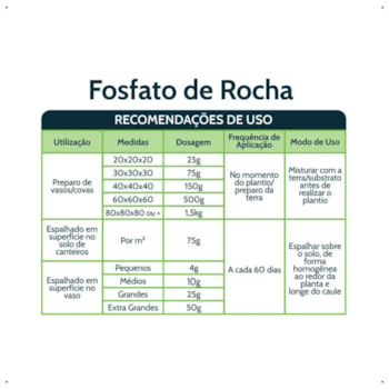 Preparo de vasos/covas de plantio | 60x60x60 | 500g | no momento do plantio/ou preparo da terra | Misturar com a terra/substrato antes de realizar o plantio. |