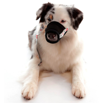 Instruções de uso: Colocar a focinheira com a parte maior para baixo e travar o fecho atrás do pescoço.