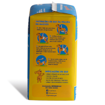 Para utilizar as fraldas, basta abrir a fralda com a parte interna voltada para a barriga do pet. Certifique-se de que o pet esteja totalmente coberto pela fralda antes de colar os adesivos. Com a ajuda da fita em velcro, feche a fralda com um pouco de pressão, sem apertar a barriga do seu cão. É importante lembrar que as fraldas são funcionais apenas para o xixi.