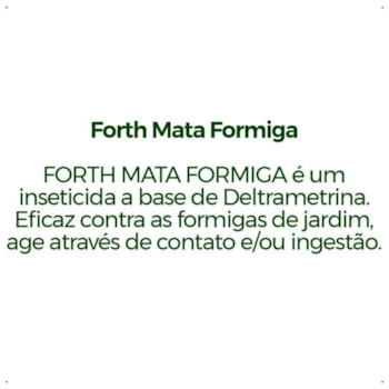 A fórmula avançada do Inseticida Mata Formiga Forth conta com o ingrediente ativo Deltametrina, que demonstra sua eficácia no combate não apenas às formigas, mas também a outros tipos de insetos. Sua ação se dá por meio de contato e/ou ingestão, garantindo uma abordagem abrangente para eliminar essas pragas incômodas que podem prejudicar suas plantas.
