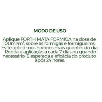 Para garantir melhores resultados, aplique o Inseticida Mata Formiga Forth na dosagem de 100ml por metro quadrado (100ml/m²). Foque especialmente nas áreas afetadas por formigas e formigueiros. Lembre-se de evitar a aplicação nos horários mais quentes do dia, para garantir a eficácia do produto.
