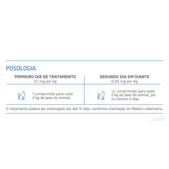 Dosagem recomendada: 1 comprimido para cada 2 kg de peso corporal no primeiro dia; ½ comprimido a cada 2 kg de peso corporal a partir do segundo dia.
