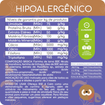 O triptofano presente na proteína de BSF atua como um agente de equilíbrio emocional, oferecendo suporte aos cães que apresentam comportamentos mais agitados ou que passam por situações estressantes, como carros, visitas, mudanças de ambiente, ruídos intensos ou períodos de solidão. A camomila e o maracujá, presentes na formulação, complementam essa proposta acalmadora com propriedades suaves e naturais.