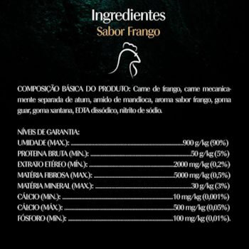 Carne de frango, carne mecanicamente separada de atum, carne de peixes, amido de mandioca, aroma sabor frango, goma guar, goma xantana, EDTA dissódico, nitrito de sódio.