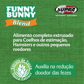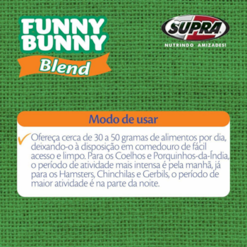 A Ração Funny Bunny Blend para Coelhos, Hamster e Roedores é produzido com pellets de alfafa, lâminas de milho, e maça e cenoura desidratada, sendo uma mistura rica de vitaminas, minerais e nutrientes para uma alimentação saudável para o seu pet.