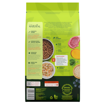 Seleção de Ingredientes de Origem Animal, mín. 60% (dos quais mín. 16% são Carnes Selecionadas: Carne de Ovino, Carne Mecanicamente Separada de Frango e Fígado de Frango; Farinha de Vísceras de Aves, Farinha de Torresmo, Ovo em Pó, Óleo de Vísceras de Aves, Gordura Suína, Óleo de Peixe Refinado, Hidrolisado de Fígado Ave e Suíno). Seleção de Cereais Integrais, mín. 35% (Arroz Integral, Grão de Aveia, Cevada em Grão, Grão de Sorgo). Seleção de Vegetais, Frutas, Vitaminas, Minerais e Ingredientes Funcionais, máx. 5% (dos quais máx. 3% são Vegetais e Frutas Selecionados: Ervilha, Brócolis Desidratado, Espinafre Desidratado, Cenoura Desidratada, Mirtilo Desidratado “Blueberry”, Amora Desidratada, Maçã Desidratada, Manga Desidratada, Polpa de Beterraba, Farinha da Alga Schizochytrium sp., Semente de Psyllium, Levedura Seca de Cervejaria, Óleo de Linhaça; Cloreto de Potássio, Carbonato de Cálcio, Hexametafosfato de Sódio, Extrato de Yucca mín. 0,05%, L-Lisina, Taurina, DL-Metionina, Propionato de Cálcio, Sorbato de Potássio, Aditivos Prebióticos: Inulina e Parede Celular de Levedura Fonte de Mananoligossacarídeos; Antioxidantes Naturais: Extrato de Alecrim e Concentrado de Tocoferóis; Aditivo Adsorvente: Parede Celular de Levedura e Bentonita; Vitaminas: A, D3, E, K3, C, B1, B2, B6, B12, Pantotenato de Cálcio, Ácido Fólico, Ácido Nicotínico, Biotina, Cloreto de Colina; Minerais: Sulfato de Zinco, Sulfato de Ferro, Sulfato de Manganês, Iodato de Cálcio; Minerais Quelatados: Proteinato de Manganês, Levedura Enriquecida com Selênio, Proteinato de Zinco, Proteinato de Cobre).