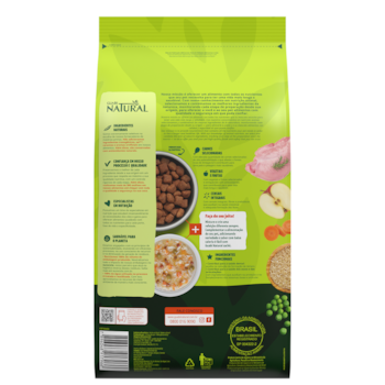 - Ingredientes naturais: frango e arroz integral, sem corantes artificiais ou transgênicos.