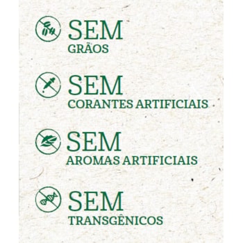 Fórmula: Sem grãos, transgênicos, sal, aromas e corantes artificiais.