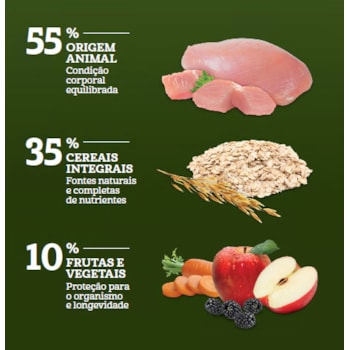 Seleção de Ingredientes de Origem Animal, mín. 55% (dos quais mín. 16% são Carnes Selecionadas: Carne Mecanicamente Separada de Frango e Fígado de Frango; Farinha Mista de Peru e Frango, Farinha de Vísceras de Aves, Farinha de Torresmo, Ovo em Pó, Óleo de Vísceras de Aves, Gordura Suína, Óleo de Peixe Refinado, Hidrolisado de Fígado Ave e Suíno). Seleção de Cereais Integrais, mín. 35% (Arroz Integral, Grão de Aveia, Cevada em Grão, Grão de Sorgo). Seleção de Vegetais, Frutas, Vitaminas, Minerais e Ingredientes Funcionais, máx. 10% (dos quais máx. 8% são Vegetais e Frutas Selecionados: Ervilha, Brócolis Desidratado, Espinafre Desidratado, Cenoura Desidratada, Mirtilo Desidratado “Blueberry”, Amora Desidratada, Maçã Desidratada, Manga Desidratada, Polpa de Beterraba, Farinha da Alga Schizochytrium sp., Semente de Psyllium, Casca de Aveia Moída, Casca de Ervilha Moída, Levedura Seca de Cervejaria, Óleo de Linhaça; Cloreto de Potássio, Carbonato de Cálcio, Sulfato de Condroitina, Sulfato de Glicosamina, Parede Celular de Levedura Fonte de Beta-Glucanos, Hexametafosfato de Sódio, Extrato de Yucca, L-Lisina, Taurina, DL- Metionina, L-Carnitina, Propionato de Cálcio, Sorbato de Potássio, Aditivos Prebióticos: Inulina e Parede Celular de Levedura Fonte de Mananoligossacarídeos; Antioxidantes Naturais: Extrato de Alecrim e Concentrado de Tocoferóis; Aditivo Adsorvente: Parede Celular de Levedura e Bentonita; Vitaminas: A, D3, E, K3, C, B1, B2, B6, B12, Pantotenato de Cálcio, Ácido Fólico, Ácido Nicotínico, Biotina, Cloreto de Colina; Minerais: Sulfato de Zinco, Sulfato de Ferro, Sulfato de Manganês, Iodato de Cálcio; Minerais Quelatados: Proteinato de Manganês, Levedura Enriquecida com Selênio, Proteinato de Zinco, Proteinato de Cobre).