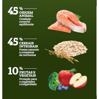 Seleção de Ingredientes de Origem Animal, mín. 45% (Farinha de Peixe Salmão, Ovo em Pó, Óleo de Vísceras de Aves, Gordura Suína, Óleo de Peixe Refinado, Hidrolisado de Fígado Ave e Suíno). Seleção de Cereais Integrais, mín. 45% (Arroz Integral, Grão de Aveia, Cevada em Grão, Grão de Sorgo). Seleção de Vegetais, Frutas, Vitaminas, Minerais e Ingredientes Funcionais, máx. 10% (dos quais máx. 8% são Vegetais e Frutas Selecionados: Ervilha, Brócolis Desidratado, Espinafre Desidratado, Cenoura Desidratada, Mirtilo Desidratado “Blueberry”, Amora Desidratada, Maçã Desidratada, Manga Desidratada, Polpa de Beterraba, Farinha da Alga Schizochytrium sp., Semente de Psyllium, Levedura Seca de Cervejaria, Óleo de Linhaça; Cloreto de Potássio, Fosfato Bicálcico, Hexametafosfato de Sódio, Extrato de Yucca, L-Lisina, Taurina, DL-Metionina, Propionato de Cálcio, Sorbato de Potássio, Aditivos Prebióticos: Inulina e Parede Celular de Levedura Fonte de Mananoligossacarídeos; Antioxidantes Naturais: Extrato de Alecrim e Concentrado de Tocoferóis; Aditivo Adsorvente: Parede Celular de Levedura e Bentonita; Vitaminas: A, D3, E, K3, C, B1, B2, B6, B12, Pantotenato de Cálcio, Ácido Fólico, Ácido Nicotínico, Biotina, Cloreto de Colina; Minerais: Sulfato de Zinco, Sulfato de Ferro, Sulfato de Manganês, Iodato de Cálcio; Minerais Quelatados: Proteinato de Manganês, Levedura Enriquecida com Selênio, Proteinato de Zinco, Proteinato de Cobre).
