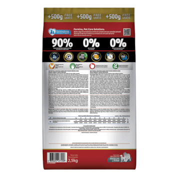 Frango (carne mecanicamente separada de frango, farinha de vísceras de aves – mín. 20%), farinha de torresmo, farinha de peixe, ovo em pó, óleo de frango, óleo de peixe, quirera de arroz, cereais e frutas (aveia, grãos de sorgo, cevada em grãos, banana desidratada, mamão desidratado, kiwi desidratado, manga desidratada – mín. 35%), farelo de trigo, polpa de beterraba, levedura seca de cervejaria, cenoura desidratada, aditivos prebióticos (FOS e MOS), DL-metionina, taurina, L-carnitina, sulfato de condroitina, sulfato de glicosamina, aditivos adsorventes (extrato de yucca e zeolita), hidrolisado de fígado de aves e suínos, vitaminas (A, D3, E, B1, B2, B5, B6, B12, C, biotina, niacina, ácido fólico, cloreto de colina), cloreto de sódio, cloreto de potássio, ferro aminoácido quelato, cobre aminoácido quelato, zinco aminoácido quelato, manganês aminoácido quelato, proteinato de selênio, iodato de cálcio, propionato de cálcio, concentrado de tocoferóis. Eventuais substitutivos: proteína hidrolisada de peixe, proteína hidrolisada de frango.