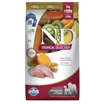 Ração N&D Tropical Selection Cães Adultos 2kg + 500g Grátis Porte Médio e Grande Sabor Frango, Cereais e Frutas Tropicais