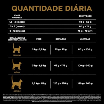 A nutrição mais avançada ao seu alcance. Desenvolvido por cientistas, veterinários e nutricionistas, Purina® Pro Plan® Filhotes traz o poder da nutrição para saúde e bem-estar do seu gato. Carne de frango como primeiro ingrediente, fonte de proteína de alto valor biológico e alta digestibilidade que proporciona um ótimo nível de nutrientes de forma eficaz. Nossa tecnologia exclusiva OptiStart® formulada especialmente com uma combinação inovadora de nutrientes, como o colostro que reforça e favorece o desenvolvimento dos sistemas de proteção do filhote durante seu primeiro ano de vida. Contém prebióticos naturais que equilibram a flora intestinal e promovem um sistema digestivo estável, para que o gatinho possa absorver uma quantidade maior de nutrientes, que ajudam a estimular o crescimento e o desenvolvimento para que eles cresçam saudáveis. Contém DHA, vitamina A e a taurina que estimula o desenvolvimento do cérebro e da visão dos filhotes. Cada uma de nossas fórmulas possui ingredientes de alta qualidade, selecionados cuidadosamente para uma finalidade específica e em conjunto com os demais ingredientes, tem o objetivo de proporcionar os melhores resultados para seu gato. Purina® Pro Plan® oferece produtos de alta qualidade, fabricados com ingredientes selecionados.