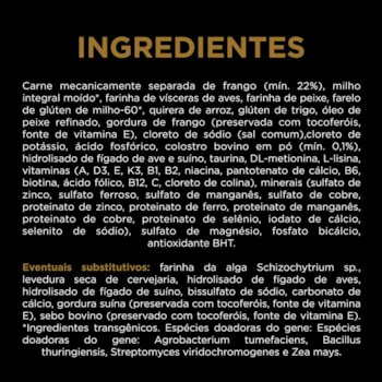 Composição básica Carne mecanicamente separada de frango (mín. 22%), milho integral moído*, farinha de vísceras de aves, farinha de peixe, farelo de glúten de milho-60*, quirera de arroz, glúten de trigo, óleo de peixe refinado, gordura de frango (preservada com tocoferóis, fonte de vitamina E), cloreto de sódio (sal comum),cloreto de potássio, ácido fosfórico, colostro bovino em pó (mín. 0,1%), hidrolisado de fígado de ave e suíno, taurina, DL-metionina, L-lisina, vitaminas (A, D3, E, K3, B1, B2, niacina, pantotenato de cálcio, B6, biotina, ácido fólico, B12, C, cloreto de colina), minerais (sulfato de zinco, sulfato ferroso, sulfato de manganês, sulfato de cobre, proteinato de zinco, proteinato de ferro, proteinato de manganês, proteinato de cobre, proteinato de selênio, iodato de cálcio, selenito de sódio), sulfato de magnésio, fosfato bicálcio, antioxidante BHT. Eventuais Substitutivos: farinha da alga Schizochytrium sp., levedura seca de cervejaria, hidrolisado de fígado de aves, hidrolisado de fígado de suíno, bissulfato de sódio, carbonato de cálcio, gordura suína (preservada com tocoferóis, fonte de vitamina E), sebo bovino (preservado com tocoferóis, fonte de vitamina E). *Ingredientes transgênicos. Espécies doadoras do gene: Agrobacterium tumefaciens, Bacillus thuringiensis, Streptomyces viridochromogenes e Zea mays.