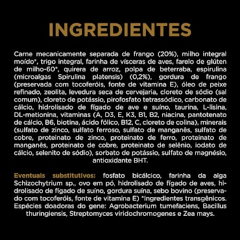 Carne mecanicamente separada de frango (20%), milho integral moído*, trigo integral, farinha de vísceras de aves, farelo de glúten de milho-60*, quirera de arroz, polpa de beterraba, espirulina (microalgas Spirulina platensis) (0,2%), gordura de frango (preservada com tocoferóis, fonte de vitamina E), óleo de peixe refinado, zeolita, levedura seca de cervejaria, cloreto de sódio (sal comum), cloreto de potássio, pirofosfato tetrassódico, carbonato de cálcio, hidrolisado de fígado de ave e suíno, taurina, L-lisina, DL-metionina, vitaminas (A, D3, E, K3, B1, B2, niacina, pantotenato de cálcio, B6, biotina, ácido fólico, B12, C, cloreto de colina), minerais (sulfato de zinco, sulfato ferroso, sulfato de manganês, sulfato de cobre, proteinato de zinco, proteinato de ferro, proteinato de manganês, proteinato de cobre, proteinato de selênio, iodato de cálcio, selenito de sódio), sorbato de potássio, sulfato de magnésio, antioxidante BHT. Eventuais substitutivos: fosfato bicálcico, farinha da alga Schizochytrium sp., ovo em pó, hidrolisado de fígado de aves, hidrolisado de fígado de suíno, gordura suína, sebo bovino (preservado com tocoferóis, fonte de vitamina E) *Ingredientes transgênicos. Espécies doadoras do gene: Agrobacterium tumefaciens, Bacillus thuringiensis, Streptomyces viridochromogenes e Zea mays.
