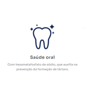 - Saúde oral: com hexametafosfato de sódio que ajuda a reduzir a formação de tártaro;
