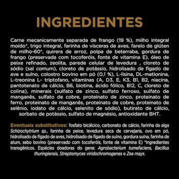 Carne mecanicamente separada de frango (19 %), milho integral moído*, trigo integral, farinha de vísceras de aves, farelo de glúten de milho-60*, quirera de arroz, polpa de beterraba, gordura de frango (preservada com tocoferóis, fonte de vitamina E), óleo de peixe refinado, zeolita, parede celular de levedura , cloreto de sódio (sal comum), cloreto de potássio, hidrolisado de fígado de ave e suíno, colostro bovino em pó (0,1 %), L-lisina, DL-metionina, L-treonina, L- triptofano, vitaminas (A, D3, E, K3, B1, B2, niacina, pantotenato de cálcio, B6, biotina, ácido fólico, B12, C, cloreto de colina), minerais (sulfato de zinco, sulfato ferroso, sulfato de manganês, sulfato de cobre, proteinato de zinco, proteinato de ferro, proteinato de manganês, proteinato de cobre, proteinato de selênio, iodato de cálcio, selenito de sódio), butirato de cálcio, sorbato de potássio, sulfato de magnésio, antioxidante BHT. Eventuais substitutivos: fosfato bicálcico, carbonato de cálcio, farinha da alga Schizochytrium sp., farinha de peixe, levedura seca de cervejaria, ovo em pó, hidrolisado de fígado de aves, hidrolisado de fígado de suíno, gordura suína, farinha de atum, sebo bovino (preservado com tocoferóis, fonte de vitamina E) *Ingredientes transgênicos. Espécies doadoras do gene: Agrobacterium tumefaciens, Bacillus thuringiensis, Streptomyces viridochromogenes e Zea mays.