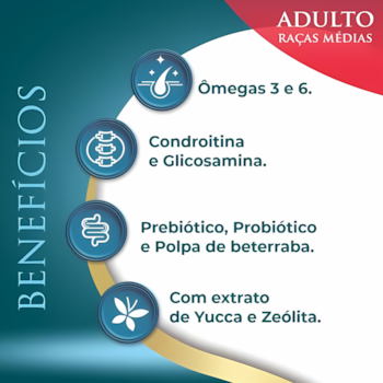 Farinha de vísceras de aves, quirera de arroz, farinha de torresmo, farinha de carne de bovino, sorgo integral moído, farelo de trigo, óleo de aves, hidrolisado de fígado de aves e suínos, farinha de batata doce (0,5%), polpa desidratada de beterraba (0,30%), grão de linhaça, biomassa de microalgas (Schizochytrium sp), parede celular de levedura (Mananoligossacarídeo - 0,10%), probiótico (Bacillus cereus var toyoi, Bacillus subtilis, Saccharomyces cerevisiae, Lactobacillus acidophilus, Enterococcus faecium), DL- metionina, cloreto de sódio (sal comum), cloreto de potássio, cúrcuma (Cúrcuma longa - 0,05%), sulfato de condroitina (0,03%), sulfato de glicosamina (0,05%), extrato de Yucca (0,05%), zeólita (0,05%), BHA (Butilhidroxianisol), BHT (Butilhidroxitolueno), biotina, vitamina A, vitamina D3, vitamina E, vitamina C, vitamina K3, vitamina B1, vitamina B2, vitamina B6, vitamina B12, niacina, ácido pantotênico, ácido fólico, cloreto de colina, sulfato de ferro, sulfato de cobre, sulfato de manganês, sulfato de zinco, zinco aminoácido quelato, iodato de cálcio, selenito de sódio, selênio aminoácido quelato, aluminossilicato de cálcio e sódio, ácido propiônico, antioxidante natural (extrato de alecrim, chá verde, hortelã e concentrado de tocoferol - 0,04%).
