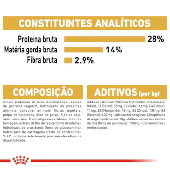 Quirera de arroz, farinha de vísceras de aves, farelo de glúten de milho*, fibra de soja*, farinha de torresmo, gordura suína, gordura de frango, polpa de beterraba, óleo de peixe refinado, glúten de trigo, óleo de soja refinado*, óleo de borragem, cloreto de sódio (sal comum), cloreto de potássio, carbonato de cálcio, óxido de magnésio, hidrocloreto de glicosamina, sulfato de condroitina, tripolifosfato de sódio, sorbato de potássio, fruto-oligossacarídeos, extrato de marigold, extrato de chá verde, zeolita, vitaminas (A, C, D3, E, B1, B2, B6, B12, PP), ácido pantotênico, biotina, ácido fólico, cloreto de colina, sulfato de ferro, sulfato de cobre, óxido de manganês, óxido de zinco, iodato de cálcio, levedura enriquecida com selênio, cobre aminoácido quelato, manganês aminoácido quelato, zinco aminoácido quelato, taurina, L-carnitina, palatabilizante à base de fígado de frango, antioxidante (BHA).