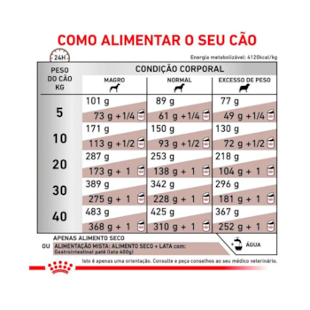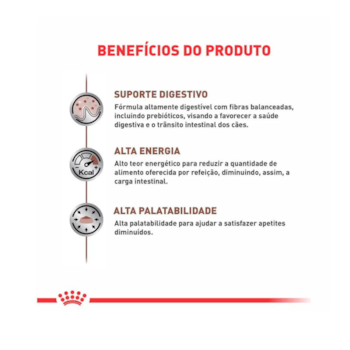 A Ração Royal Canin Veterinary Diet Gastrointestinal é um alimento coadjuvante seco indicado para cães adultos, formulado visando auxiliar na redução de distúrbios agudos de absorção intestinal e na recuperação do estado nutricional saudável em animais convalescentes. Ingredientes de alta digestibilidade. Nível aumentado de eletrólitos e alta concentração de nutrientes essenciais. Alta densidade energética. Fórmula altamente digestível com fibras balanceadas, incluindo prebióticos, visando favorecer a saúde digestiva e o trânsito intestinal dos cães. Alto teor energético para reduzir a quantidade de alimento oferecida por refeição, diminuindo assim a carga intestinal. Alta palatabilidade para ajudar a satisfazer apetites diminuídos.