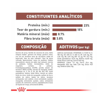 Quirera de arroz, farinha de vísceras de aves, milho integral moído*, gordura de frango, gordura suína, ovo em pó, levedura seca de cervejaria, polpa de beterraba, óleo de soja refinado*, óleo de peixe refinado, lignocelulose, casca de psyllium, fosfato monocálcico, cloreto de sódio (sal comum), cloreto de potássio, fosfato monossódico, óxido de magnésio, sorbato de potássio, frutooligossacarídeos (0,35%), parede celular de levedura (MOS) (0,19%), extrato de marigold, zeolita, vitaminas (A, C, D3, E, B1, B2, B6, B12, PP), ácido pantotênico, biotina, ácido fólico, cloreto de colina, óxido de zinco, óxido de manganês, sulfato de ferro, sulfato de cobre, iodato de cálcio, levedura enriquecida com selênio, zinco aminoácido quelato, manganês aminoácido quelato, cobre aminoácido quelato, DL-metionina, taurina, palatabilizante à base de fígado de frango, antioxidante (BHA).
