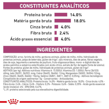 Quirera de arroz, milho integral moído*, gordura de frango, farinha de trigo, farelo de glúten de milho*, polpa de beterraba, glúten de trigo, óleo de peixe refinado, fibra de soja*, óleo de soja refinado*, cloreto de sódio (sal comum), cloreto de potássio, casca de psyllium, levedura seca de cervejaria, carbonato de cálcio, zeolita, fruto-oligossacarídeos, sorbato de potássio, citrato de potássio, extrato de marigold, vitaminas (A, E, D3, C, B1, B2, B6, B12, PP), ácido pantotênico, biotina, ácido fólico, cloreto de colina, sulfato de ferro, sulfato de cobre, óxido de manganês, óxido de magnésio, óxido de zinco, iodato de cálcio, levedura enriquecida com selênio, cobre aminoácido quelato, manganês aminoácido quelato, zinco aminoácido quelato, L-lisina, DL-metionina, taurina, L-triptofano, palatabilizante à base de fígado de frango, antioxidante (BHA).