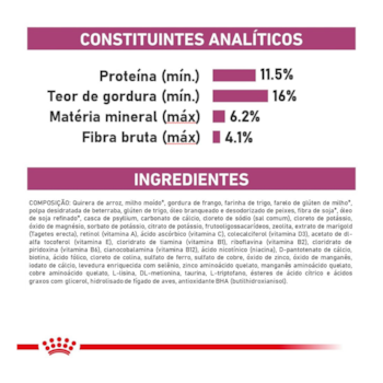 Quirera de arroz, milho integral moído*, gordura de frango, farinha de trigo, farelo de glúten de milho*, polpa de beterraba, glúten de trigo, óleo de peixe refinado, fibra de soja*, óleo de soja refinado*, cloreto de sódio (sal comum), cloreto de potássio, casca de psyllium, levedura seca de cervejaria, carbonato de cálcio, zeolita, fruto-oligossacarídeos, sorbato de potássio, citrato de potássio, extrato de marigold, vitaminas (A, E, D3, C, B1, B2, B6, B12, PP), ácido pantotênico, biotina, ácido fólico, cloreto de colina, sulfato de ferro, sulfato de cobre, óxido de manganês, óxido de magnésio, óxido de zinco, iodato de cálcio, levedura enriquecida com selênio, cobre aminoácido quelato, manganês aminoácido quelato, zinco aminoácido quelato, L-lisina, DL-metionina, taurina, L-triptofano, palatabilizante à base de fígado de frango, antioxidante (BHA).