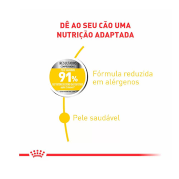 Alimento completo para cães adultos e maduros com tendência a irritações de pele e coceira (peso entre 26 e 44 kg) - A partir de 15 meses de idade. Formulado nutricionalmente com ácidos graxos ômega 3 & 6, incluindo GLA, EPA e DHA que ajudam a nutrir a pele sensível. Formulado para apoiar o cuidado da pele sensível do seu cão e manter a pelagem abundante e saudável. 91% dos tutores estão satisfeitos após 2 meses*. *Estudo interno Royal Canin. Satisfaz o apetite de cães de grande porte graças a uma variedade de aromas cuidadosamente selecionados.