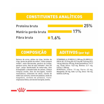 Quirera de arroz, glúten de trigo, farinha de trigo, farelo de glúten de milho*, milho integral moído*, aveia descascada, gordura de frango, gordura suína, óleo de soja refinado*, fibra de soja*, polpa desidratada de beterraba, óleo branqueado e desodorizado de peixes, linhaça integral moída, óleo de borragem, fosfato monocálcico, carbonato de cálcio, cloreto de sódio (sal comum), cloreto de potássio, óxido de magnésio, sorbato de potássio, fruto-oligossacarídeos, extrato de marigold, zeolita, retinol (vitamina A), ácido ascórbico (vitamina C), colecalciferol (vitamina D3), acetato de d-alfa tocoferol (vitamina E), cloridrato de tiamina (vitamina B1), riboflavina (vitamina B2), cloridrato de piridoxina (vitamina B6), cianocobalamina (vitamina B12), ácido nicotínico (niacina), ácido pantotênico, biotina, ácido fólico, cloreto de colina, óxido de zinco, óxido de manganês, sulfato de ferro, sulfato de cobre, iodato de cálcio, levedura enriquecida com selênio, zinco aminoácido quelato, manganês aminoácido quelato, cobre aminoácido quelato, L-lisina, taurina, DL-metionina, L-carnitina, palatabilizante à base de fígado de frango, antioxidante (BHA).
